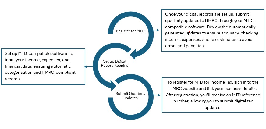 Sole traders must register for MTD with HMRC, link their business details, and receive an MTD reference number