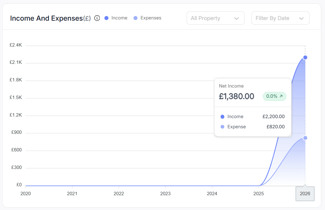 Every repair bill, letting agent fee, insurance premium, and mortgage payment you've logged, all totalled up and categorised.