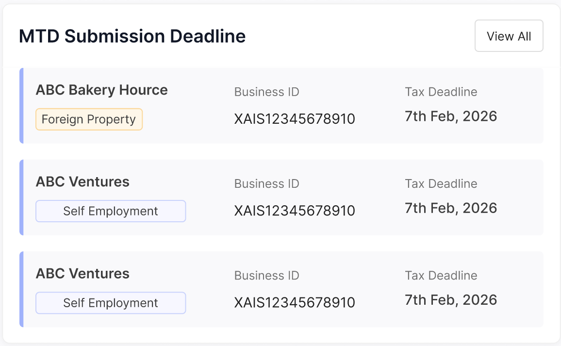 RentalBux connects directly to HMRC's systems. When a quarterly deadline approaches, you review your figures (which have been building up automatically from your invoices and expense records), confirm everything looks right, and press Submit. That's it.