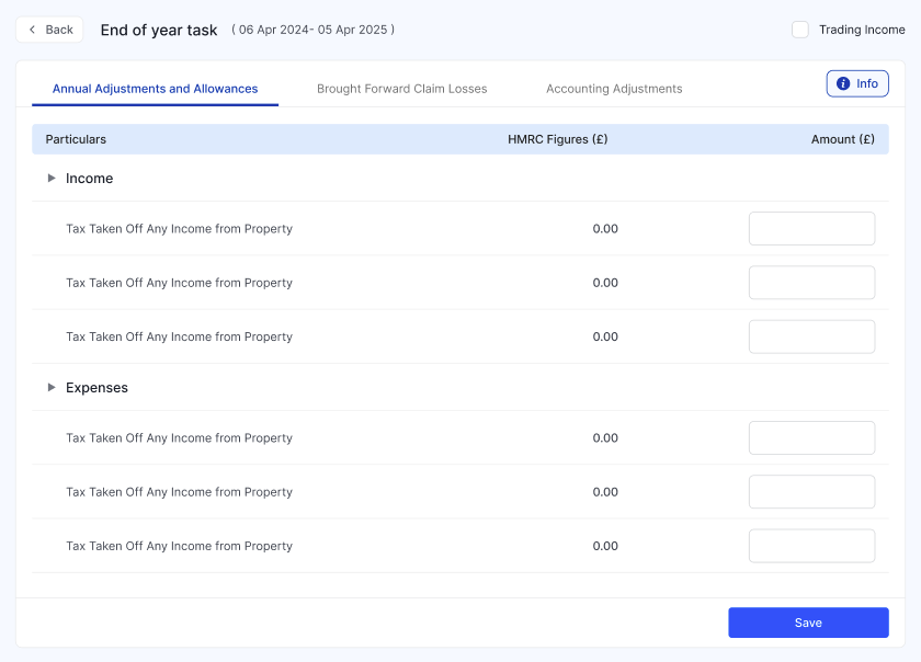 At the end of the tax year, after your fourth quarterly update, you'll also need to submit a Final Declaration, which confirms your total income position for the year. It appears in the MTD > Tax Submission screen when they become due. RentalBux prepares them automatically from your accumulated quarterly data.